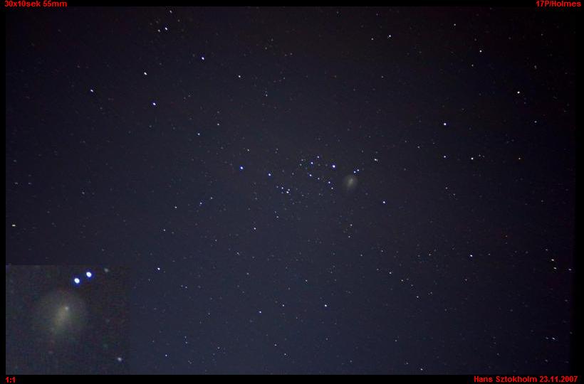 W październiku 2007 roku, niepozorna kometa - 17p Holmes - zaskoczyła wszystkich nieoczekiwanymi fajerwerkami. Praktycznie z dnia na dzień pojaśniała kilkadziesiąt tysięcy razy (według niektórych źródeł nawet do pół miliona razy) stając się widoczna gołym okiem nawet z centrów dużych miast. Ta konkretna fotografia została wykonana praktycznie z ręki na parkingu w centrum Sztokholmu. Pomimo niewielkich rozmiarów na niebie, głowa komety osiągnęła rozmiary zbliżone do rozmiarów Słońca.