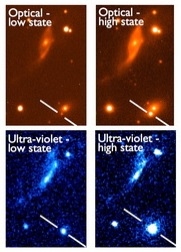 Pierwsze otrzymane wyniki jeszcze bardziej zaciemniły zagadkę. Wybuchy były doskonale widoczne w ultrafiolecie (UV) ale nie odnotowano żadnych zmian w intensywności promieniowania X w czasie erupcji. Dziwne, ponieważ gdy nad białym karłem zapada się dysk akrecyjny złożony z ukradzionego wodoru, zmiany w paśmie rentgenowskim są bardzo wyraźne. Tymczasem Swift meldował o całkowitej ciszy... Co zatem trafiło do dysku akrecyjnego? Na pewno nie był to wodór, bo tego ani za bardzo nie ma na białych karłach ani nie został zanotowany przez sensory Swifta. A może hel? Helu na białych karłach jest pod dostatkiem.