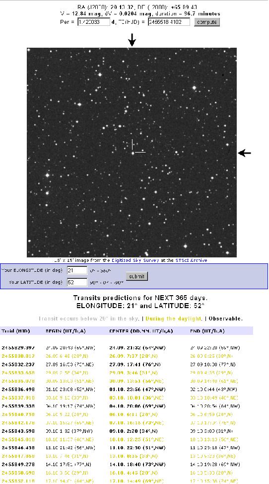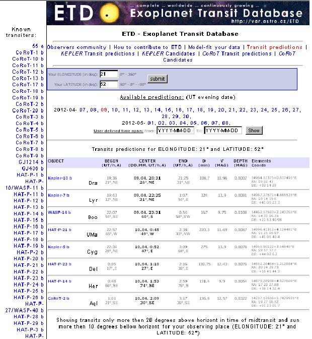 Po wejściu w zakładkę transit predictions - http://var2.astro.cz/ETD/predictions.php - i wprowadzeniu naszej pozycji geograficznej, dostaniemy w jasnej, czytelnej formie precyzyjne efemerydy planet pozasłonecznych, tranzytujących w dogodnych dla obserwatora warunkach. Coś, co kilka lat temu zajmowało mi godziny, dostajemy na tacy w sekundy. Jak już wspomniałem, załoga ETD przesiewa spore już ilości znanych nam pozasłonecznych układów planetarnych, podając nam jedynie dogodne obiekty na daną noc. Dogodne, czyli takie, których tranzyt zmieści się dla nas w godzinach nocnych (dzienne są eliminowane) i nie zbliży się do horyzontu na mniej niż 20*. Należy jednak pamiętać, że tranzyt który kończy się 21* nad horyzontem w kierunku, gdzie mamy łunę od naszego miasta, kępę drzew, latarnię, wzgórze lub są to okolice, w których przebywa nasz łysy satelita, to kiepski pomysł.