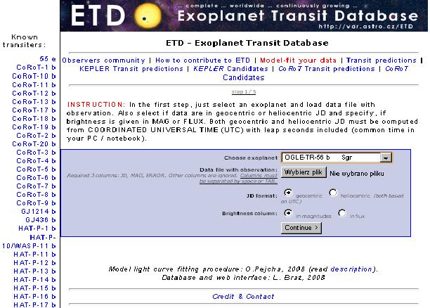 Pytanie może wydawać się nieco dziwaczne w Google-rzeczywistości, ale gdy zaczynałem realizację pierwszych rejestracji pozasłonecznych planet, nie było wcale oczywiste gdzie amator może próbować się dokopać do efemeryd, czym się kierować i czy aby na pewno to co odkopał jest poprawne (trafiłem na sporo błędnych materiałów). W styczniu 2009, przy moich pierwszych rejestracjach tranzytów, sieć była znacznie uboższa niż teraz. Dla amatora z Polski były to czasy nieaktywnej już AXA (Amateur Exoplanet Archive) i myszkowania za nie zawsze poprawnymi efemerydami, bezpośrednio w bazach uniwersyteckich (czasem w dziwnych językach). Dziś jest łatwiej, sprawniej i lepiej. Doskonałym przykładem skutecznego wsparcia i zorganizowania jest czeska Exoplanet Transit Database - ETD - http://var2.astro.cz/ETD/