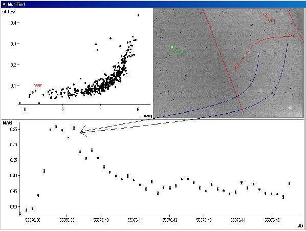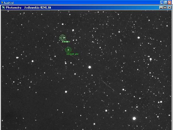 To efekt problemów algorytmu z pomiarem w ciasnym polu gwiazdowym, wywołanym niedoskonałościami prowadzenia. Tuż obok mojego obiektu jest druga gwiazda, w odległości około 3 pikseli. Montaż korygując prowadzenie, co jakiś czas „ruszał” lekko kadrem. Dla algorytmów Muniwina z jakiegoś powodu te drobne zmiany umknęły i biedak zliczał część fotonów, ślizgającej się po granicy apertury pomiarowej, towarzyszki. Po zwiększeniu apertury pomiarowej do 6 pikseli, światło obu bliskich gwiazd było traktowane jak jeden obiekt i „zmienność” okazała się szybko artefaktem. Oczywiście stosowanie dużych apertur pomiarowych i „dołączanie” do naszej nosicielki planet pobliskich gwiazd to proszenie się o kłopoty, ale przy stosowaniu kolorowych matryc i technik lekko niezogniskowanego obrazu, możemy trafić w tego typu problemy w rejonach Drogi Mlecznej, lub stosując krótkie ogniskowe gdzie na każdy piksel matrycy będzie przypadać kilka lub wręcz kilkanaście sekund łuku. Kolejnym czynnikiem który może nam dać dosyć zaskakujące wyniki są śmieci. To nie żart. Przykład poniżej.