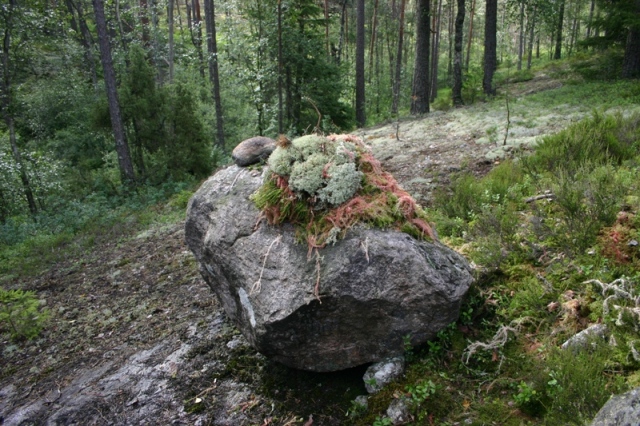 Po oddaleniu się polną drogą o jakiś kilometr od szosy w kierunku rezerwatu, stwierdził, że to nie ma sensu. On sam, plecak, i prawdopodobnie wszystko wewnątrz pływało w lodowatej deszczówce. Paździoch wypatrzył skalistego hilla który dobrze rokował. Tylko jak się na niego wtranżolić? Poza polną drogą podmokłe łąki, sam hill to dosyć strome, granitowe skały porośnięte mchem, jagodami i małymi jałowcami. Trzeba się jakoś dostać na ten płaski szczyt. O, jest chyba całkiem ładny trawersik. Ładujemy się. Pierwszy krok, podparcie o mokry granit wolną ręką. Fajt! *#*! ...ony mech. Nie zemną te numery Bruner. Wejdę na te wzgórze i zrobię to po tobie! Korekta na przyczepność mchu. Zamach. Sluup! Że co? Noga do pół łydki weszła w nasączony jak gąbka mech docierając do twardego granitu. Kępa mchu w ramach zemsty, wyżęła w nogawkę Paździocha jakiś litr lodowatej wody. O, żesz ty *#*!...ony mszaku. O nie, takimi tanimi sztuczkami mnie nie odstraszysz. Po około kwadransie rozchwianej wspinaczki Paźdzoch zdobył ścianę. Niestety. Z obecnego punktu widzenia, hill nie wydawał się już tak atrakcyjny, jak z drogi poniżej. Niemniej po kilku minutach poszukiwania, Paździoch odnalazł względnie sensowne, płaskie miejsce bez stojącej wody. Rozbicie namiotu okazało się względnie łatwe i szybkie. Co prawda wewnątrz było sporo zasuszonych roślinek charakterystycznych dla bagien Store Mosse, ale kolejne 5 minut pracy załatwiło sprawę.
