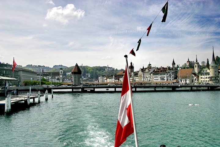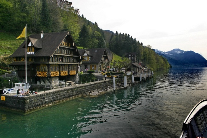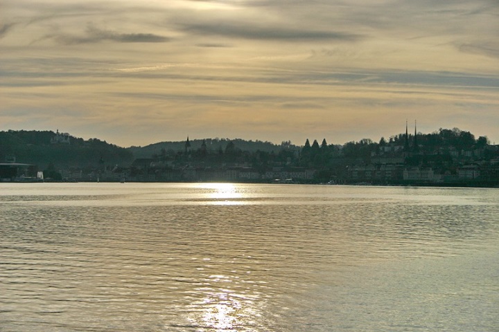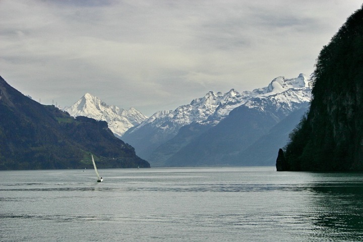 No dobra, po przeczytaniu cen za wycieczkowce, czym prędzej polazłem do kasy biletowej czegoś w rodzaju wodnego tramwaju kursującego pomiędzy wiochami na brzegach jeziora (spory stateczek klasy tych wycieczkowych, tyle że nie fikuśny bocznokołowiec, a zwykła krypa motorowa z barem i dwupiętrowym tarasem widokowym. No fajnie, 20 CHF zostało w kieszeni. Wsiadłem, zawył syreną i niespiesznie odpłynął... Rejs bomba, zarąbiste widoczki, robię sobie fotki, a stateczek sobie nieśpiesznie płynie od wiochy do wiochy coraz głębiej w góry... Minęła godzina, a stateczek sobie nieśpiesznie płynie coraz głębiej, w coraz piękniejsze góry... Khem, minęła druga godzina, a stateczek płynie sobie nieśpiesznie coraz głębiej, w coraz piękniejsze góry... Minęła trzecia godzina... o w mordę,  <censored>! do Hotelu wróciłem po 7-miu.