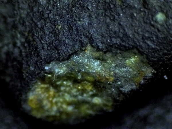 Koleżka oczywiście reaguje na magnes, ale... na moje oko, to zielone to Oliwin, a tego minerału akurat w meteorytach za wiele być nie powinno... wedle niektórych źródeł, w ogóle nie powinno. To akurat szybko się wyjaśniło w trakcie dyskusji na AP <link>. Oliwin jest spotykany w meteorytach. Nawet Stardust przytargał oliwiny w swoich próbkach pyłu kosmicznego. Ciekawe jednak robi się inne pytanie. Skąd oliwiny w meteorytach? Jaką drogę ewolucji przeszedł ten okruch w moich rękach. Oliwiny to minerały głębinowe. Na geologii wbijali mi do głowy, że to właśnie z oliwinów głównie, jest zbudowany płaszcz Ziemski. Czyżby coś rozwaliło w pył naprawdę spory obiekt, z siłą, która wyrzuciła resztki jego płaszcza tak mocno, że zdołały dolecieć do Ziemi jako meteoryty? Duże bum. ... Największy kryształ który widać, ma nieco ponad 0,2 milimetra i może to być jedynie widoczny fragment czegoś jeszcze trochę większego, ukrytego w środku. Generalna zasada mówi, że Im większy kryształ, tym więcej miał czasu na przyrost. A oliwiny rosną, głęboko... Fajnie sobie pomyśleć, że mam w rękach świadka rozgrywki bilardowej z dziecięcego okresu U.S... Prawda może być też taka, że to "tylko" wulkaniczny pocisk z jakiegoś mniejszego, aktywnego moona, który został wyrzucony z taką siłą, że opuścił orbitę mamuśki i po długim błąkaniu się trafił na Ziemie, do mnie. Lub coś pośredniego, jak zasugerował mi Dobsonme z AP - (...) wszystkie minerały jakie znajdujesz w meteorytach (...) powstały przy formowaniu się Układu Słonecznego. Twój meteoryt pochodzi z płaszcza jakiejś planetoidki co to miała pewnie ze kilka do może ze stu kilometrów(...) Temperatura no to wiadomo, że wtedy dość wysoka była, to wszystko co tam dzisiaj lata praktycznie było wtedy płynne. W końcu skoro żelazo spłynęło do centrum planetoidy, a na powierzchni powstały chondry to dosyć ciepłe to być musiało. (...)