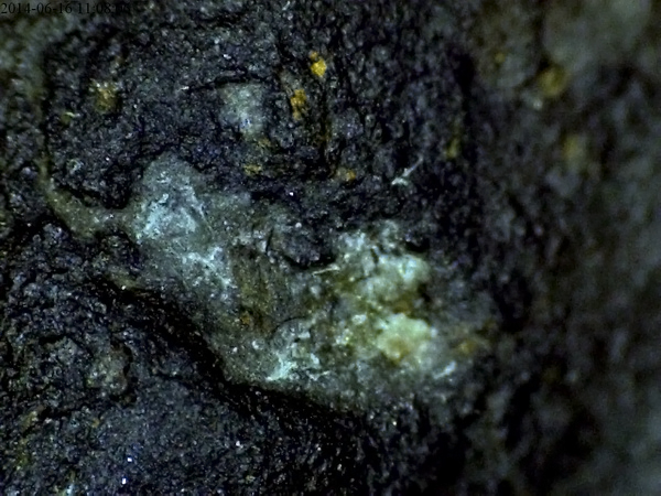 Mam więc do czynienia z popularnym chondrytem. Kłopot w tym, że wedle wiki powinien on wyglądać zupełnie inaczej niż to co widzicie obok. Odkryłem w nim bowiem kilka odprysków, co sprowokowało mnie do sięgnięcia po gówniany elastic-plastic mikroskop. Fotki są jakie są, więcej z tego chińczyka nie wyciągnę, ale jednak są i pokazują coś mocno odbiegającego od wizji przedstawionej przez wiki.