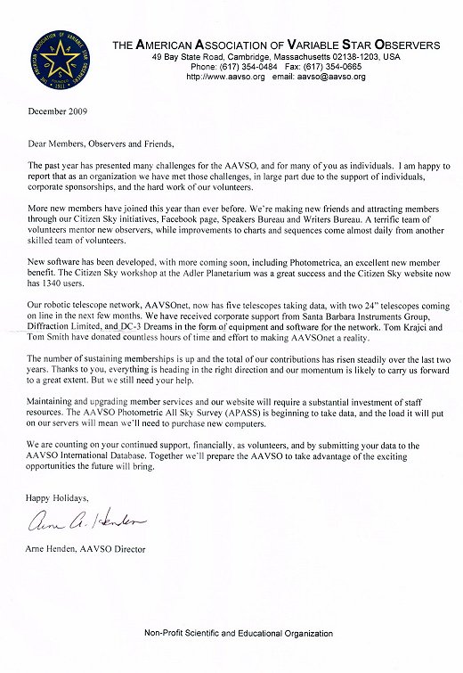 Czytam, czytam i naszła mnie taka niewesoła myśl. Patrząc na formę i treść tego listu, jest dla mnie jasne, że AAVSO to organizacja która wie jaki ma cel, istnieje dla niego. Skupia się na jego osiągnięciu. Zależy jej na wszystkich jej członkach którzy pomagają jej w sprostaniu zadaniom. Jest to w moim odczuciu bardzo skontrastowane z tym co obserwuję pośród polskich organizacji zrzeszających amatorów astronomii. Dla mnie, to zupełnie inne emocje, inne wartości. Wystarczyło kilka dni obserwacji ludzi z krakowskiego PTMA na zlocie w Bieszczadach parę lat temu, kilka przeczytanych wspomnień Hermesa na AF gdzie na otwarcie obserwatorium ściąga się orkiestrę, kuriozalne wręcz jazdy z prezesem OPP Polaris i człowiek widzi jak bardzo inny jest u nas świat. Skierowany na samą organizację. Na liderowanie i podkreślanie zasług. Na pewno nie jest tak wszędzie. Ale dla kogoś z zewnątrz, takie postrzeganie PTMA i lokalnych organizacji do PTMA podobnych to nie jest wyjątek. Mam nadzieje, że działacze już nad tym wizerunkiem pracują.