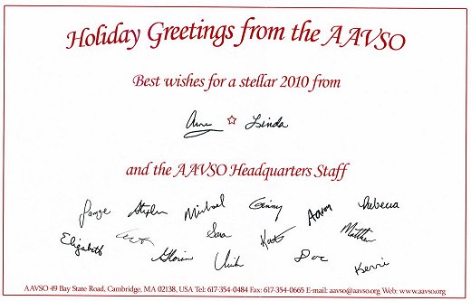 Niedawno przyszła do mnie przesyłka. Zagramaniczne znaczki i stempelki. Obce nadruki na kopercie. Jak nic alkaida rozsyła wąglika. Heh, trza być twardym. Przy otwieraniu wypadła piękna (choć mocno sfatygowana) pocztówka z Plejadami. Odwracam i czytam: Holiday Greetings from the AAVSO...