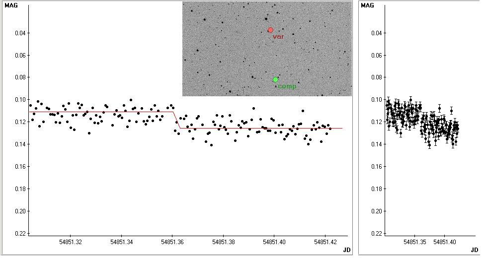 Jest to podobno pierwsza, amatorska rejestracja egzoplanety w Polsce. Na pewno jest to pierwsza moja rejestracja (2009-01-19). XO-2b to egzoplaneta idealna do amatorskiego łapania. W okresie zimowym tranzytuje szybko i w pobliżu zenitu (RA 07 48 06.46, DEC +50 13 32.9). Ten gorący Jowisz obiega gwiazdę (GSC 03413-00005) typu K0V odległą od nas o niecałe 150 parseków. Masa tego obcego świata jest prawie dwukrotnie mniejsza niż masa Jowisza , ale rozmiarami są te planety bardzo podobne (0.973Rj). Ta dysproporcja to wynik napuchnięcia atmosfery XO-2b wywołanego bliskością swej gwiazdy matki. ( 0.0369 AU ). Pędząc wokół gwiazdy (2.6 dnia na pełny obieg), ten obcy świat nagrzewa się do 1200*K! Istne inferno.