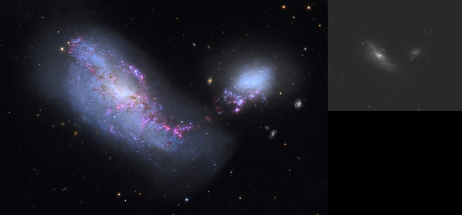 Fotka testowa, ogarniam powoli nowy setup. Prosta obróbka. Traktuję to jako badanie na co mogę sobie pozwolić, mając na pokładzie duży refraktor achromatyczny. Pewnie materiał pozwolił by wyciągnąć jeszcze niejedno ale od strony obróbki ja  prosty człowiek, więc to już raczej mój max. A na fotografii widać  Pokręcone po kolizji NGC4490 i NGC4485. Tam między nimi jest pomost aktywnych obszarów HA i młodych gwiazd... ale nie z moim niebem i obróbką :/ Jako pierwsza idzie materiał z MLO zestawiony z moimi plastusiami