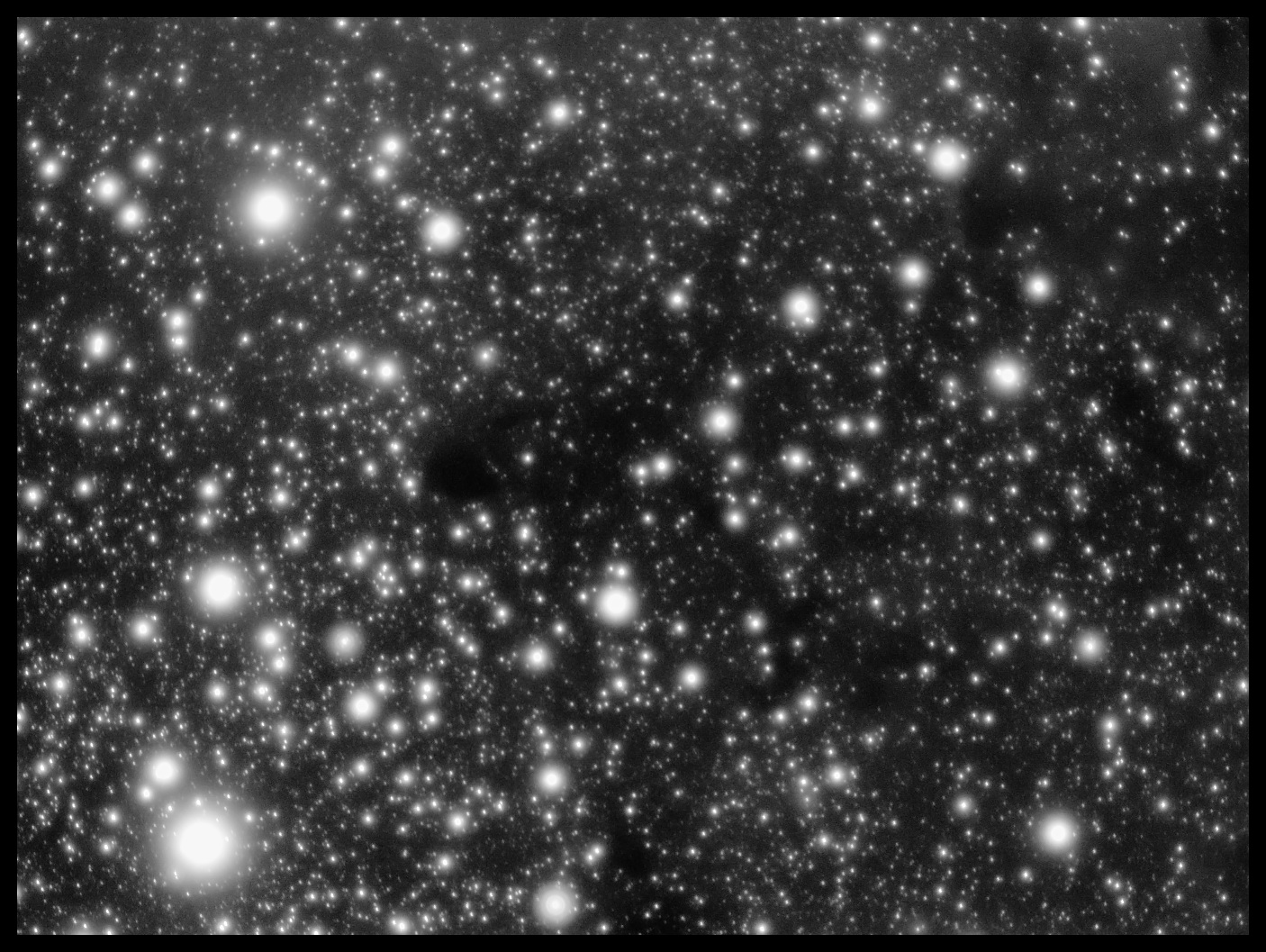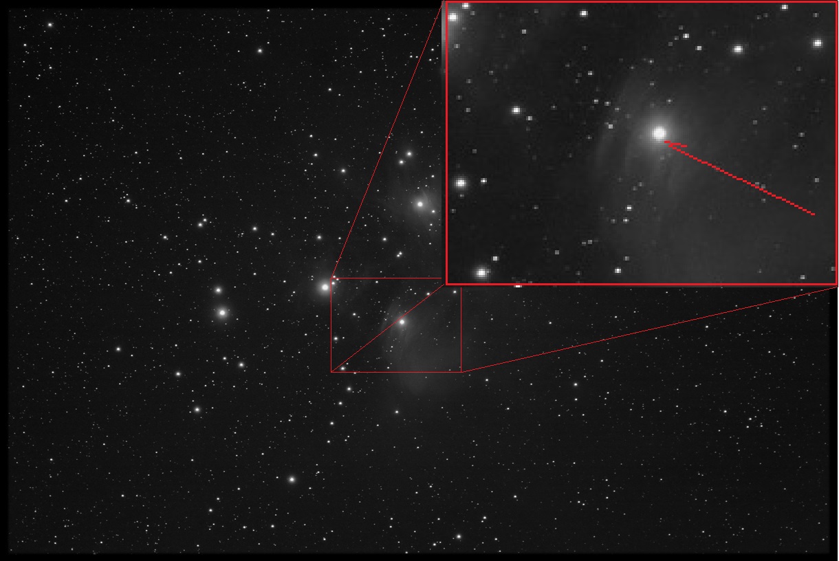 Pomimo wyjątkowo niesprzyjającego układu czynników dla tak mikrych struktur (długie czasy naświetlania, niewielka ogniskowa, i niezwykle bliskie sąsiedztwo jasnej gwiazdy) "udało się" zarejestrować mgławicę refleksyją IC349 (ma przy takiej ogniskowej zaledwie kilka pixeli i zlewa się z Merope która przy 5-cio minutowych klatkach praktycznie pożarła okolice). Na Astropolis można pooglądać prace bardziej zaawansowanych astrofotografów z tą mgląwicą w roli głównej - link