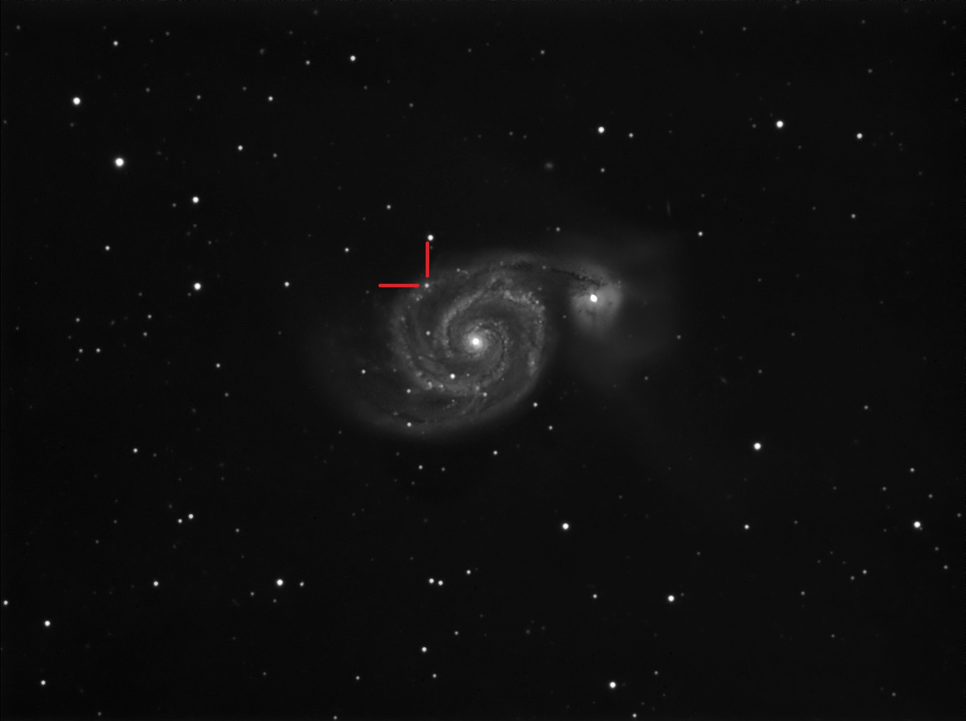 SN2011dh w M51 - 2011-06-04/05 uchwycona w trakcie spontanicznej akcji na Astropolis - link - podczas przeglądu zdjęć, który miał pozwolić dokładniej ustalić czas eksplozji supernowej. Wygląda na to, że świeciła ponad dobę nieodkryta... a taka popularna galaktyka ;) Trochę informacji o samym pechowcu: R.A. = 13h 30m 05s.22 Dec. = +47° 10' 12".41 Typ: IIp (czyli klasyczna supernova powstała z gwiazdy która doszła swych dni - tutaj trochę więcej: http://www.universetoday.com/73365/type-ii-p-supernovae-as-a-new-standard-candle/ ).