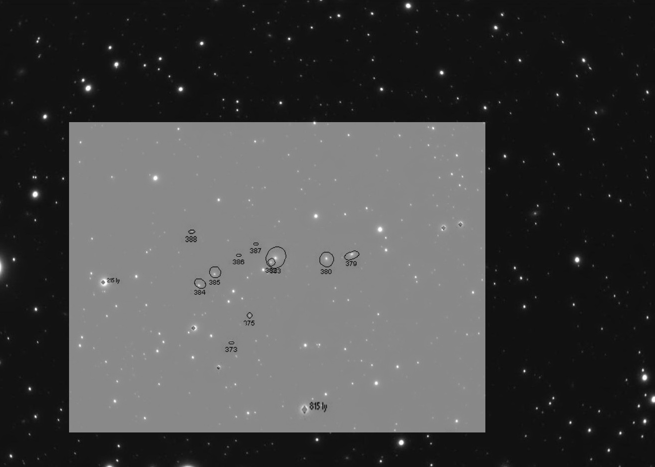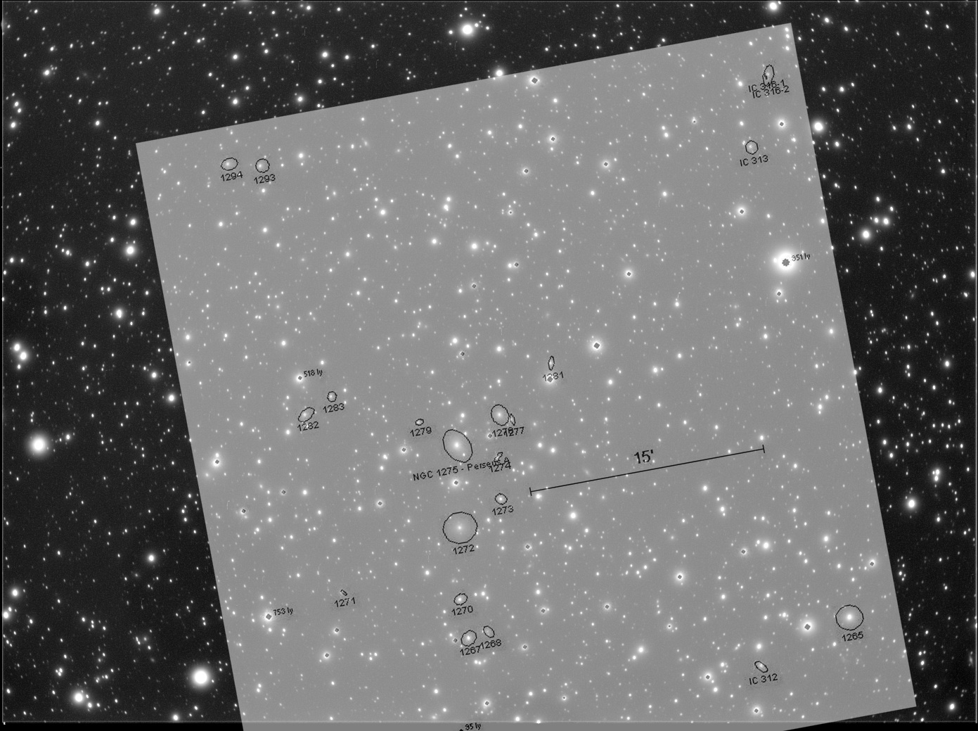 Fragment supergromady galaktyk Perseus-Pisces Supercluster (jedna z największych znanych struktur we wszechświecie. Odległa od nas o ok. 250 mly jest supergrupą do której należy wiele mniejszych powiązanych grawitacyjnie grup galaktyk. Rozmiary tego obiektu to 40°!) Pisces Cloud to zbitka niewielkich galaktyczek przypominających kurczaki maszerujące za kwoką (NGC383).