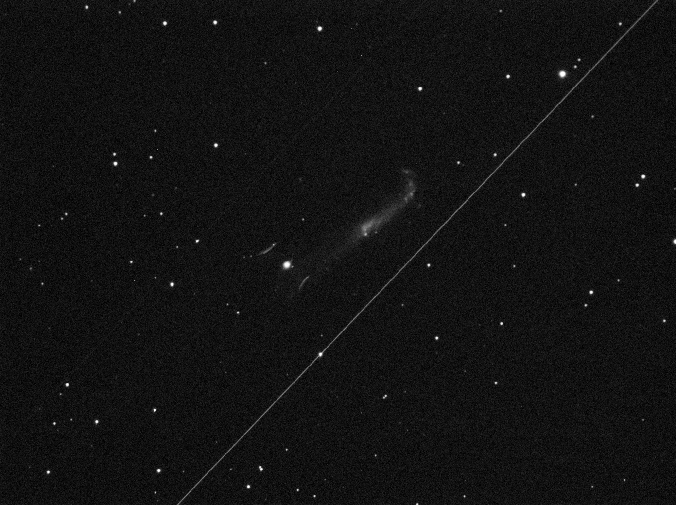 Opadła mi szczęka, gdy przeglądając schodzące z kamery fotki zobaczyłem to. Ilość czynników jakie musiały zgrać się w czasie, aby dać taki efekt jest nieprawdopodobna. To co widzicie, to uchwycony ślad samolotu, który dokładnie w czasie gdy mój teleskop skierowany był na galaktykę NGC4656, przeciął centrum kadru. Mało tego, zostawił nie tylko linie śladu świateł pozycyjnych (to jeszcze nie jest takie niezwykłe), ale idealnie w momencie gdy przecinał oś teleskopu, mrugnął kolejnym światłem, na moment rozświetlając brzuch. Ten krótki moment wystarczył mojej kamerze, by zarejestrować odblask od wewnętrznych części silników, oraz delikatną poświatę od spodu kadłuba :) Jest w tym wszystkim jeszcze drugie dno. Tej nocy pył wulkaniczny znad Islandii wyrzucony do atmosfery przez erupcję wulkanu Eyjafjallajökull, przykrywał znaczną część Europy. Większość lotnisk była zamknięta, a przeloty tranzytowe bardzo ograniczone. Postaram się dowiedzieć co to za samolot i na jakiej trasie leciał. Więcej o tym przypadku można poczytać na astropolis.pl