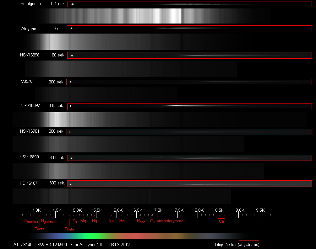 " Siedząc nad kalibracją zebranego materiału, niestety doszedłem do kilku niezbyt optymistycznych wniosków. Moja aktualna rozdzielczość to mniej więcej 8.3 angstrema na pixel. To wcale nie jest powalający wynik. Wygląda też na to, że aby dojść z zasięgiem i czytelnym widmem w rejony poniżej 14 Mag. (tam gdzie poluję na nowe zmienne) muszę zorganizować sobie albo więcej światła, albo czulszy sensor... Niby więcej światła powinno wyjść taniej, ale jak przyjdzie do tak dużego przyrostu masy OTY, że będę musiał jej też wymienić podwozie, to może się okazać, że kwoty jakie wchodzą w grę przy takim rozwiązaniu przekroczą koszt czulszego sensora."