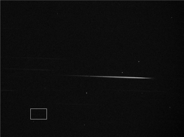 Zamiast świecącej R-Leo dostaję puste miejsce (spodziewałem jej się w rejonie zaznaczonym prostokątem). Nie ma i zaczynają się pytania. Spartoliłem nalot? Jakim cudem, GOTO działa niezależnie od siatek dyfrakcyjnych wsadzonych w tor optyczny teleskopu. A może mój spektrometr "zeżarł" całe światło z R-Leo i dlatego jej nie widzę. Może moje wcześniejsze testy dla oszacowania zasięgu po funkcji czasu naświetlania zawierają błąd? A może ja źle wyliczyłem maximum R-Leo i wcale nie miała w chwili naświetlania klatki okolic +5 mag (co na 60 sek. klatce powinno przepalać niemalże piksele nawet w sensorze potraktowanym siatką dyfrakcyjną) tylko znacznie mniej i tu leży przyczyna?
